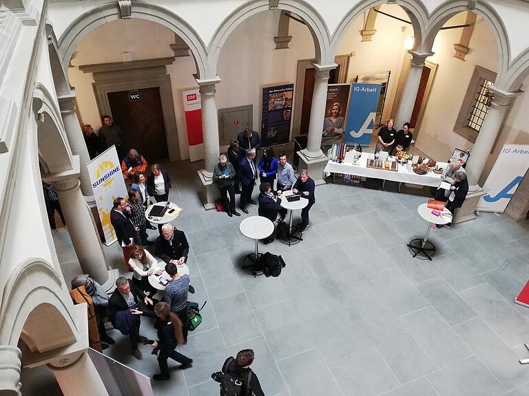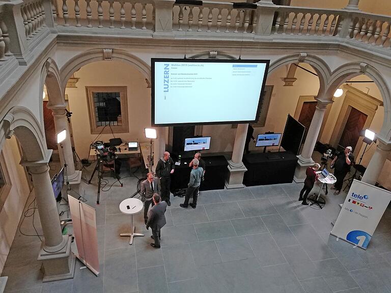 Wahlen Luzern: Noch sind wenige Kandidaten und Kandidatinnen im Regierungsgebäude in Luzern. Medienschaffende sind noch in der Überzahl.