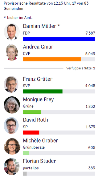 Ständerat: Sehr gut im Rennen ist der bisherige FDP-Mann Damian Müller. Der zweite Sitz gilt es nach dem Rücktritt des Bisherigen Konrad Graber (CVP) neu zu besetzen. In Luzern wittert die SVP die Chance, erstmals einen Sitz in der Kleinen Kammer zu holen und der CVP ihren traditionellen Sitz abzujagen. Sie tritt mit Nationalrat Franz Grüter an, die CVP will ihren Platz mit Nationalrätin Andrea Gmür verteidigen. Insgesamt 7 Kandidatinnen und Kandidaten kämpfen um die beiden Luzerner Ständeratssitze.