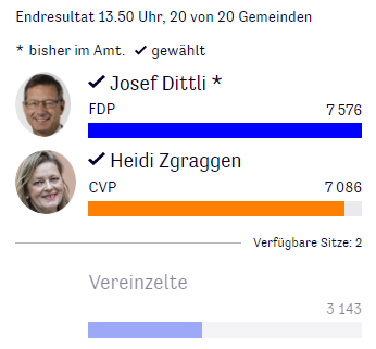 Zwischenergebnis aus dem Kanton Schwyz bei den Ständeratswahlen (20 von 30 Gemeinden):