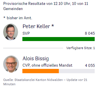 Nationalrat Nidwalden: Nach Auszählung von 9 von 11 Gemeinden liegt Peter Keller (SVP) klar in Führung. Es fehlen noch die Gemeinden Stans und Wolfenschiessen.