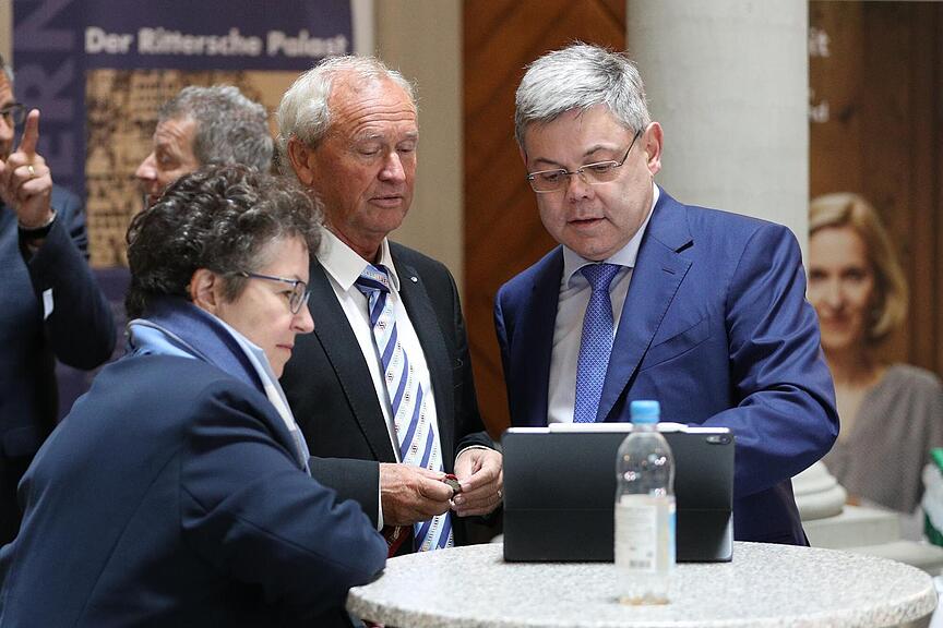 Im Regierungsgebäude treffen die ersten Besucher ein. Darunter SVP-Regierungspräsident Paul Winiker und SVP-Präsidentin sowie Nationalratskandidatin Angela Lüthold-Sidler.