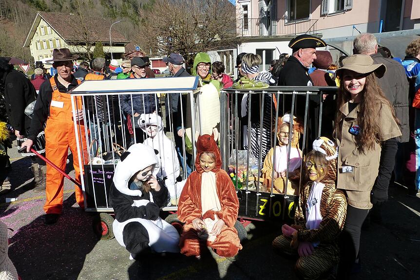 Viele Gruppen zeigten in ihren Sujets liebevoll und aufwendig gebastelte Gewänder. Der Zoo war das Thema der Kinder der Familien Schuler und Hess. Eine Konfettischlacht gehört natürlich auch dazu, sehr zum Spass von Elin und Finn. Auch den Hunger und den Durst der jungen und älteren Fasnächtler galt es zu stillen. Für Speis und Trank war die Ortsgruppe Wolfenschiessen besorgt.