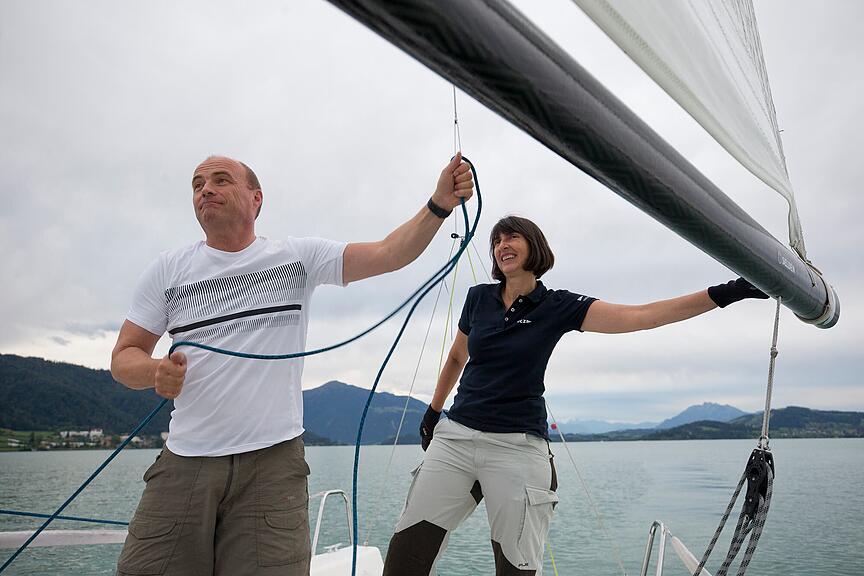 Am Ruder steht Claudia Streuli, Clubpräsidentin und Partnerin von Beat Stocker. Sie achtet beim Steuern unter anderem auf die winzigen, roten und blauen Fäden, die an der Fock (das vordere Segel) befestigt sind. An Details, wie etwa an der Beschaffenheit der Wasseroberfläche erkennen die beiden Veränderungen im Wind und reagieren sofort: Es dauert jeweils nur einen beschäftigten Augenblick mit zackigen Kommandos und gekonnten Handgriffen, bis die «Stellaluna» in wohltuender Stille und mit eleganter Leichtigkeit über das Wasser gleitet.