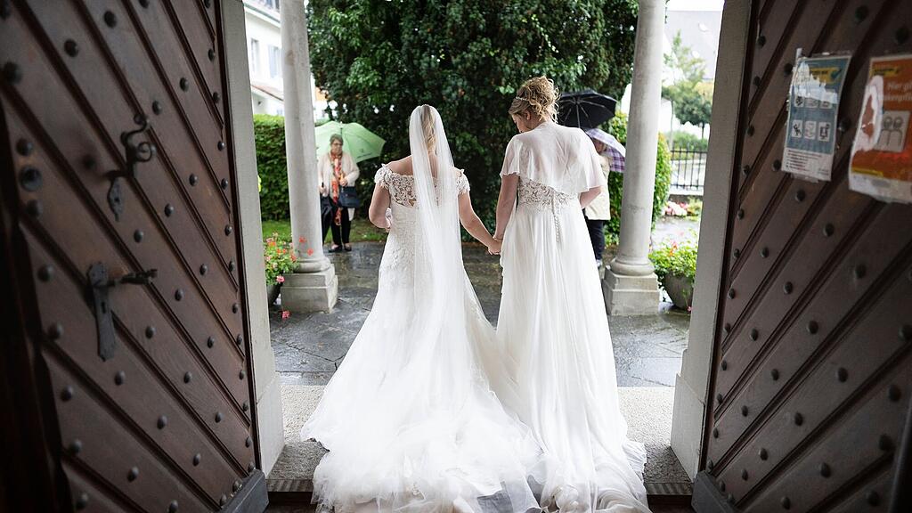 Gleichgeschlechtliche Paare können nun heiraten – zivil, nicht katholisch-kirchlich. Aber für eine Segnung zeigen sich die katholischen Zuger Pfarreien generell offen. Das Bild zeigt die Hochzeit zweier Frauen in der reformierten Kirche von Regensdorf. (Bild: Keystone)