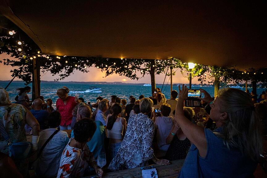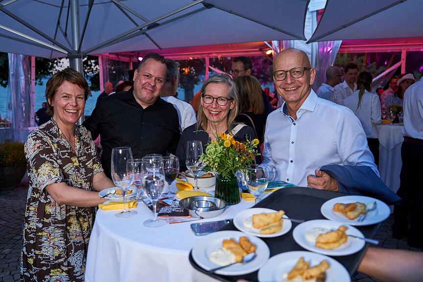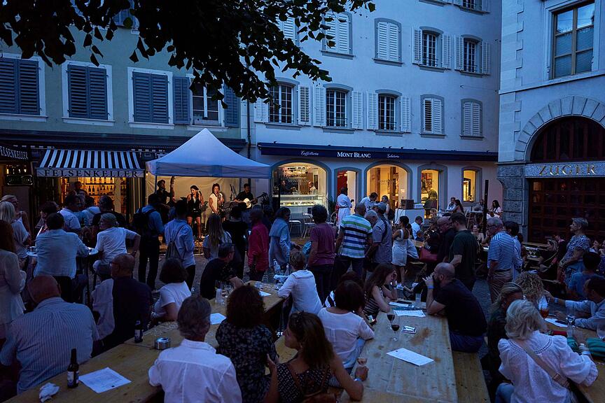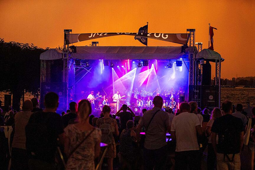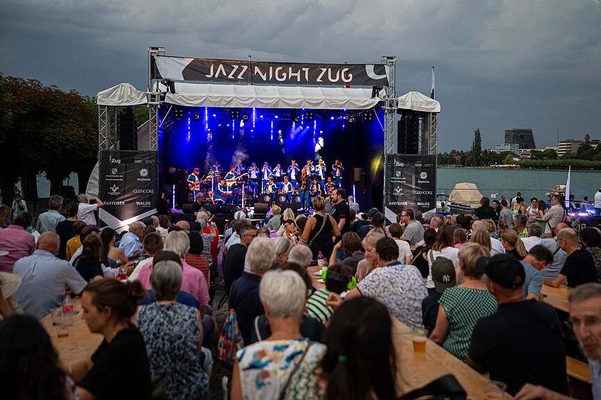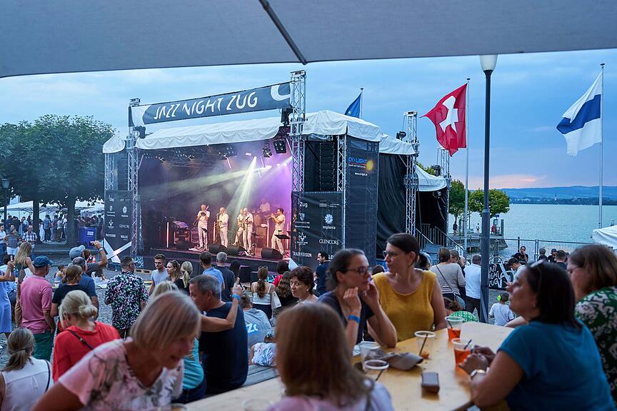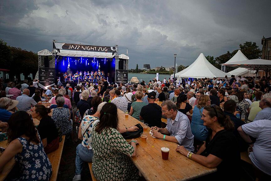 Auch bei Anlässen für geladene Gäste an der Zuger Jazz Night wie hier beim Festzelt vom Schweizer Bauunternehmen Implenia lässt sich sehr gut Zeit verbringen, eine Portion Fischknusperli essen und die Musik geniessen.