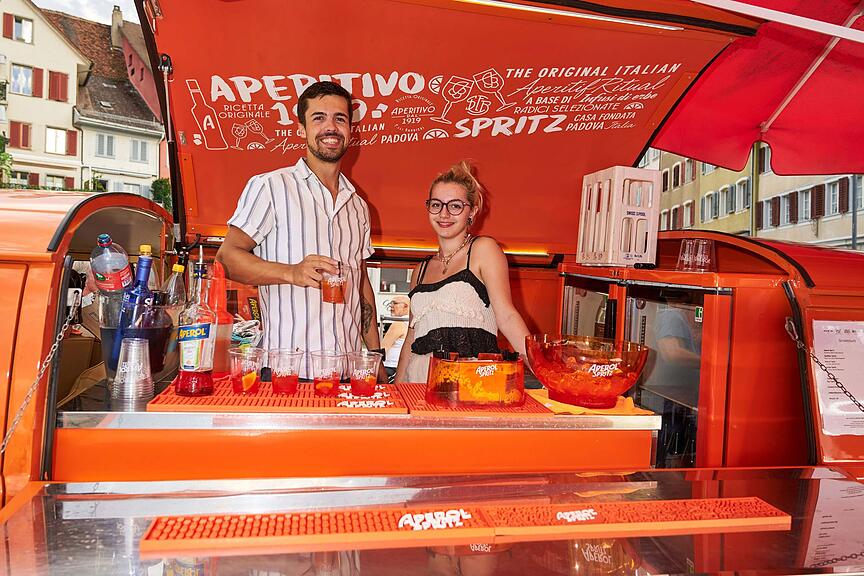 Luis Ramos (links) und Leonie Riedel servieren einen Aperol Spritz.