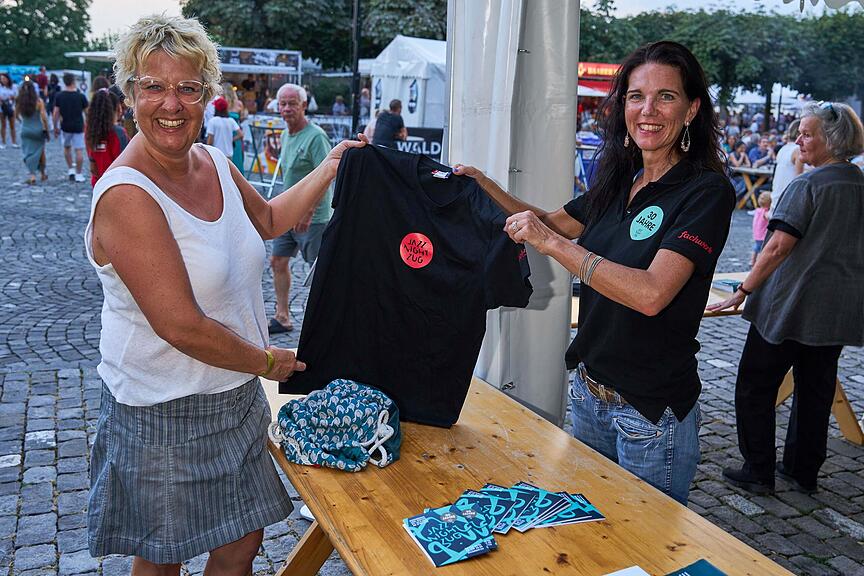 Corinne (links) erhält von Regula ein T-Shirt der Jazz Night Zug.