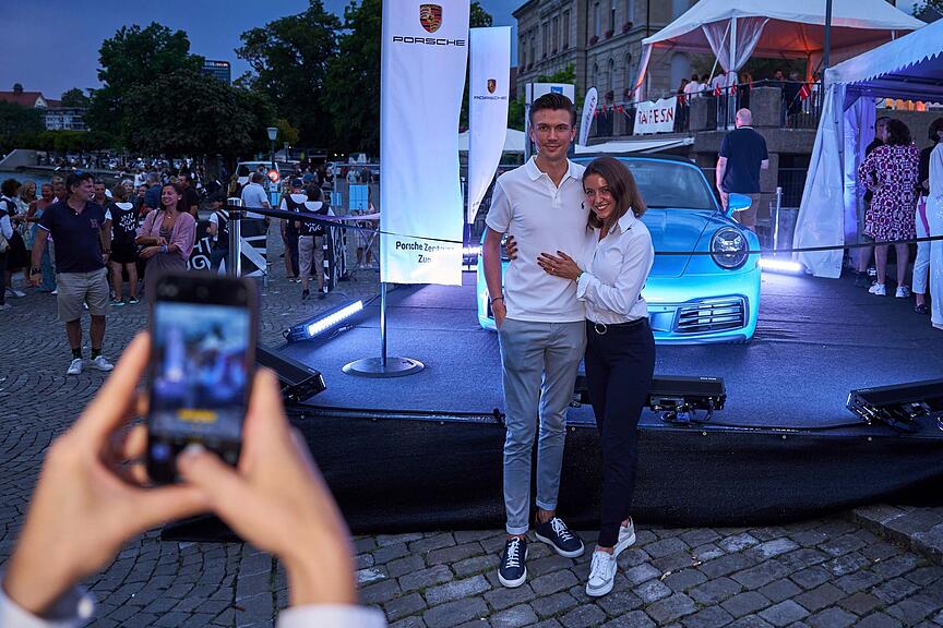 Ein begehrtes Motiv, der blaue Porsche an der Jazz Night in Zug. Da stehen Felix Hirsiger und Julie Müller gerne kurz hin.