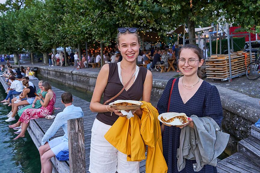 Die beiden Konzertbesucherinnen Elena und Nicole essen zuerst gemütlich etwas beim Holzsteg mit schöner Abendstimmung mit Blick auf den Zugersee.