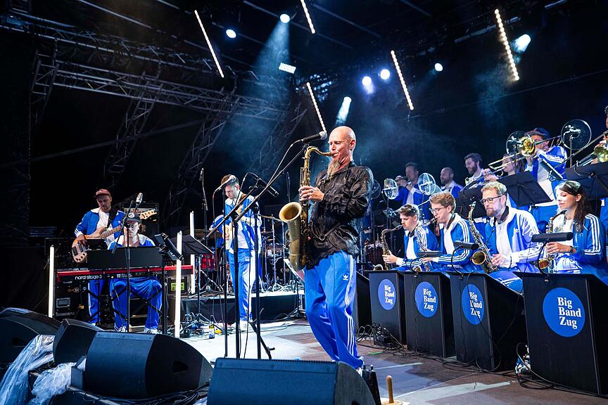 Auftritt der Big Band Zug feat. «Swiss Movement: Next Generation» vor dunklen Wolken auf der Bühne auf dem Landsgemeindeplatz.