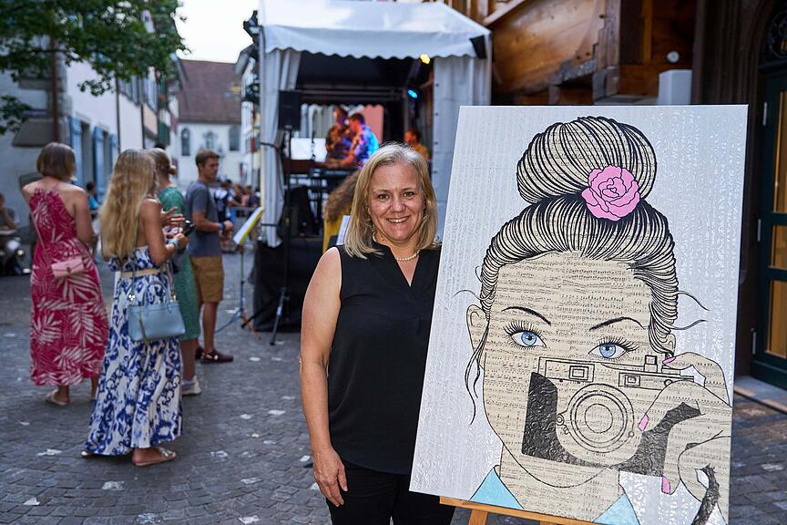 Kunst, welche zum heutigen Anlass passt, mit Musiknoten im Bild, ausgestellt von der Künstlerin Martina Niederhauser in der Altstadthalle neben der Jazz-Bühne.