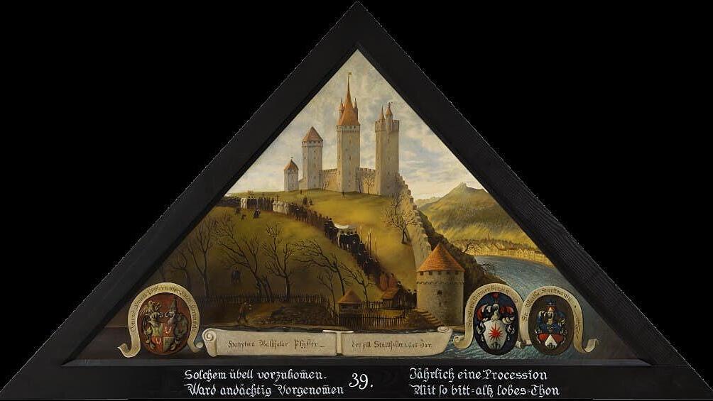 Tafel 39 (beim Grossbrand 1993 verbrannt): Prozession hinter der westlichen Museggmauer. Alljährlich im März abgehaltene Bittprozession im Gedenken an den Brand der Stadt Luzern 1340. (Replikat Schumacher)