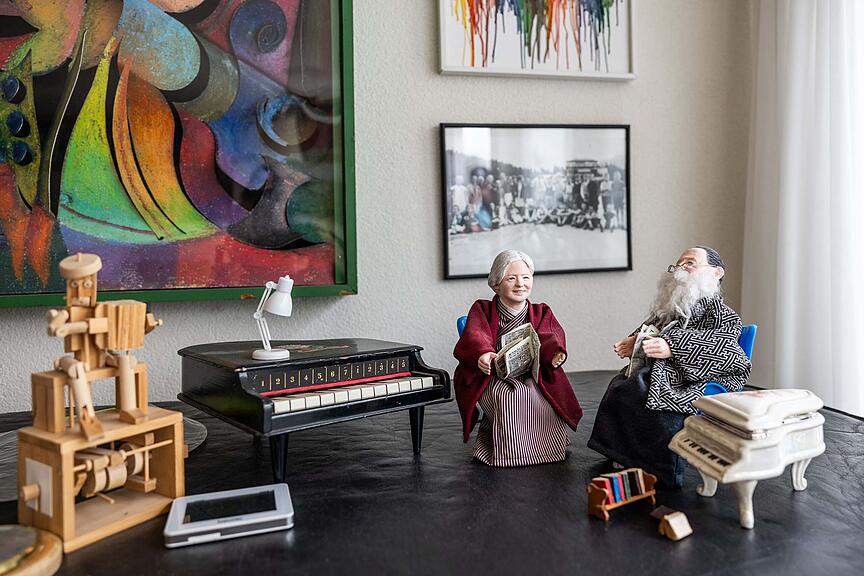 Auf dem Flügel in der Stube der Familie Hassler steht diese Dekoration: Hans Hassler mit seiner Frau Regula, angefertigt von einem japanischen Künstler.