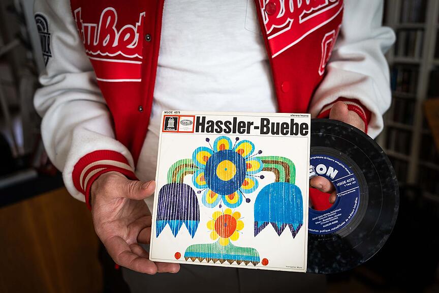 Aurel Hassler zeigt eine Schallplatte der «Hassler-Buebe». Bei dieser Band spielte Vater Hans früher als Akkordeonist mit. Die Brüder sind mit dieser Musik aufgewachsen.