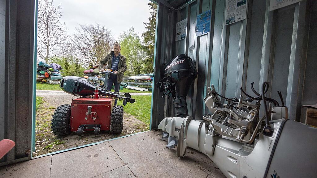 Nach dem versuchten Diebstahl vom vergangenen April bringt Valentin Moser, Bootsbesitzer und Sprecher der Platzmieterinnen und -mieter, die von der Täterschaft abgetrennten Motoren im Aufbewahrungscontainer vor Ort in Sicherheit.