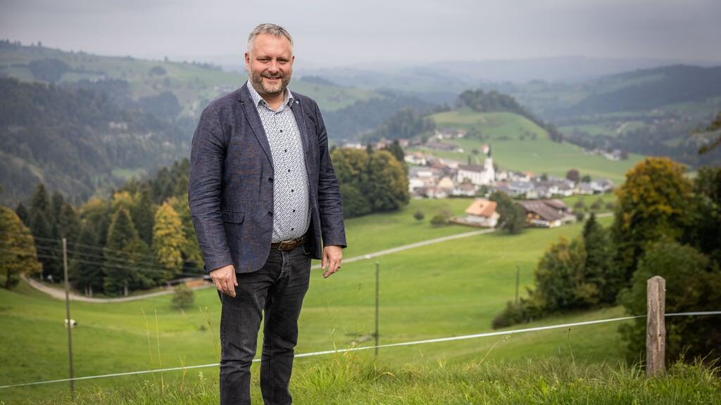 Wer sich über Mittag eine Stunde Ruhe gönnen will, findet diese in Doppleschwand. Kaum ein Auto befährt die Strasse, rund um das Gebiet beim Schulhaus ist Sendepause. Einzig Gemeindepräsident Stefan Dahinden scheint sich keine Mittagsruhe zu gönnen. Er begrüsst das Reporter-Team um 12.45 Uhr und lädt zu einer kleinen Rundfahrt mit seinem Auto ein. Nach wenigen Minuten parkiert er auf einer Anhöhe mit herrlichem Blick auf Doppleschwand – die flächenmässig kleinste Gemeinde im Entlebuch. Die Stelle ist perfekt für ein Bild mit dem 45-jährigen Dahinden und dem Dorf, dessen Ortsname 1275 erstmals als Togelswande erwähnt wurde.