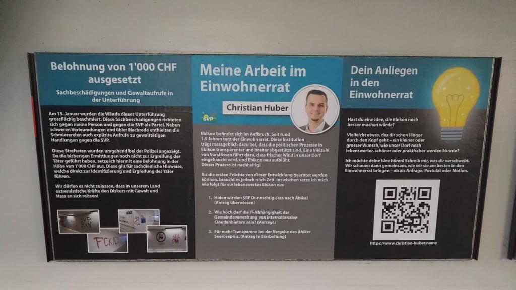 Mitte Januar sind in der Unterführung des Bahnhofs Ebikon mehrere Wände mit Beschimpfungen gegen den Einwohnerrat und Co-Präsidenten der Ebikoner SVP Christian Huber verschmiert worden. Huber wurde darauf unter anderem als «Nazischwein» und «Drecksfascho» betitelt. Auslöser dürfte der Medienwirbel um seine Teilnahme an der Hochzeit eines bekannten Mitglieds der rechtsextremen Szene gewesen sein. Huber wurde die Nähe zur Szene immer wieder vorgeworfen, im Alter von 16 bis 22 war er Mitglied der rechtsextremen Pnos – heute distanziert sich der Politiker mit Jahrgang 1987 von diesem Milieu.