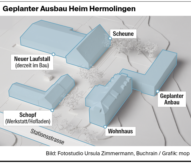 Das Vorhaben sei nicht im Sinn einer Konkurrenzierung des Rothenburger Seniorenzentrums Fläckematt gedacht, sondern als Ergänzung. Hermolingen ist ein spezielles Heim: Es wurde gegründet, um pensionierten Knechten ein Zuhause zu geben. Heute wohnen dort Männer, die in der Landwirtschaft oder in handwerklichen Berufen gearbeitet haben. Alle 36 Zimmer sind zurzeit besetzt. Deren Zahl soll gleich bleiben, dafür sollen sie grösser werden und eine eigene Toilette erhalten.