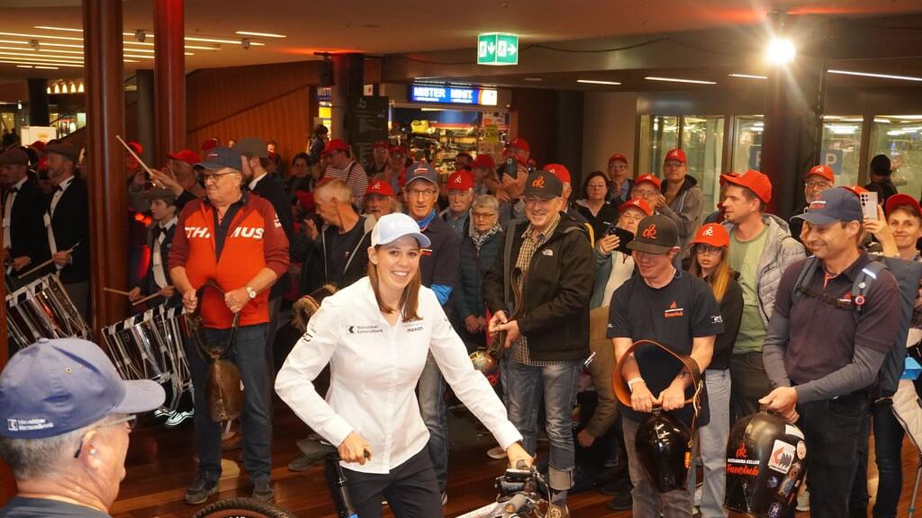 Ohrenbetäubender Lärm liess erahnen, dass sich bald eine aussergewöhnliche Sportlerin den erwartungsfrohen, spalierstehenden Fans präsentieren würde. Angeführt von Tambouren, Trichlern und Fanclub, begab sich Alessandra Keller samt ihrem Weltmeister-Bike zum Podium, wo sie von Moderator Chrigu Graf empfangen wurde. Ihm gelang es, mit Enthusiasmus die Fans vor dem Einzug aus der Reserve zu locken.