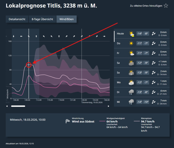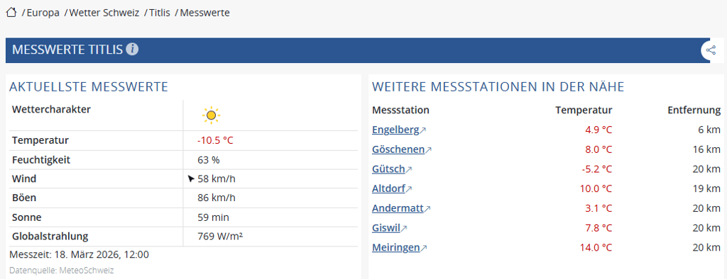 Das Wetter im Skigebiet war am Mittwochvormittag laut Meteorologen windig. Für die Messstation Titlis wies Meteo Schweiz für die Dauer von 9 bis 16 Uhr eine mässige Windgefahr (Stufe 2 von 5) aus. Laut Beschreibung der Mess- und Prognosewerte ist auf dieser Stufe in den höheren Lagen mit Windspitzen zwischen 100 und 130 km/h zu rechnen.