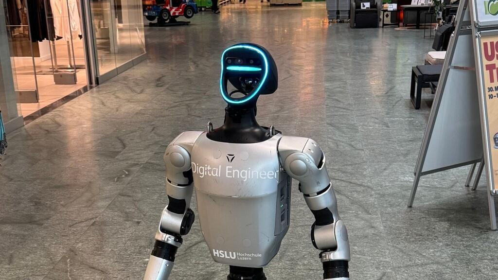 Es war ein ungewöhnlicher Anblick im Tellpark: Ein hundeartiger und ein menschenähnlicher Roboter bewegten sich durch das Einkaufszentrum in Schattdorf und zogen die neugierigen Blicke der Passantinnen und Passanten auf sich.