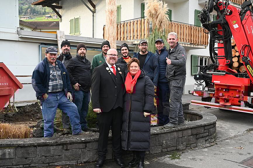 Die Herrscher über die Nidwaldner Fasnacht, Chriesipaar Markus und Nicole, Stefan I. aus dem Beggoland, Frohsinnpaar Marcel I. mit Alice und Hornbläser Jacques, sowie Altzunftmeister und Mitzünftige der Zunft Ennetbürgen, verfolgten am Samichlaustag mit weiteren Schaulustigen, wie das Team unter der Leitung von Dolf Barmettler die traditionell mit roten und weissen Bändern geschmückte Zunftmeistertanne fachgerecht stellte. Der feierliche Akt wurde durch die Sunneguugger musikalisch begleitet und die fastnächtlichen Klänge liessen die rund 200 Besucher mitwippen. Für das leibliche Wohl sorgte die durch Kollegen des neuen Zunftmeisterpaars Kevin I. und Kasia betriebene Festwirtschaft mit reichlich Wurst und Brot, Kuchen und Warm- und Kaltgetränken. Die Birger Fäger erwiesen mit ihrem kakofonischen Auftritt dem Zunftmeisterpaar die Ehre und liessen bei der Vorstellung der «Vereinigten Ennetbürger Guuggen» zusammen mit den Sunneguugger die Herzen der Fasnächtlerinnen und Fasnächtler höher schlagen.