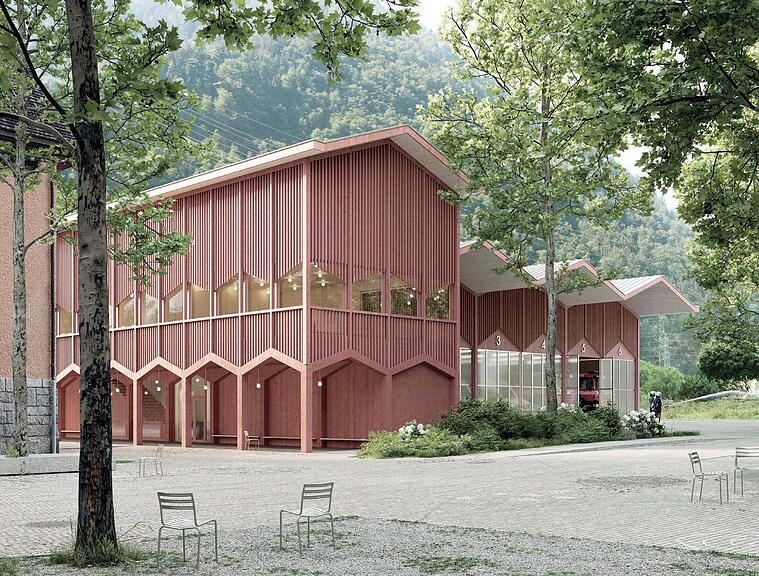 Der Ersatzbau für das heutige Pfarreizentrum soll zum neuen Stützpunkt für die Feuerwehr werden. Die Ausfahrt des Lokals mündet direkt auf die Schlossbergstrasse. Damit wird die Erschliessung vollständig vom Schulareal getrennt, was die Sicherheit auf dem Schulareal erhöht. Im gleichen Gebäude wird ein unterteilbarer Mehrzwecksaal mit Bühne, Küche und weiteren Nebenräumen realisiert. Dazu werden Räume für den Mittagstisch gebaut, damit dort bis zu 50 Kinder betreut werden können.
