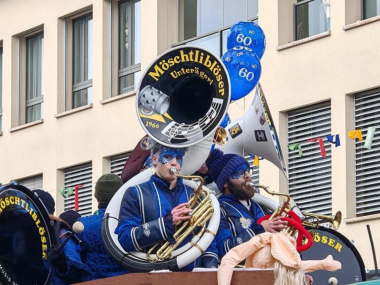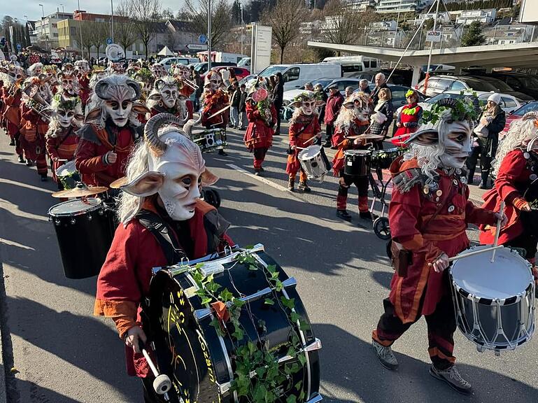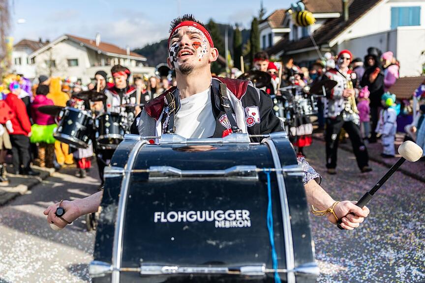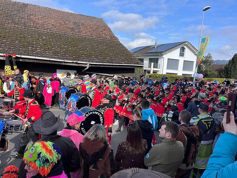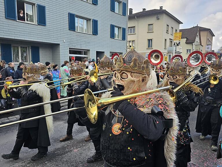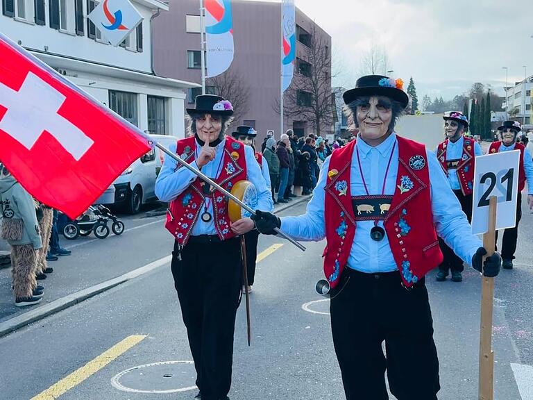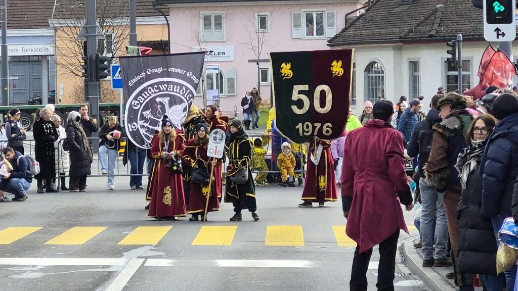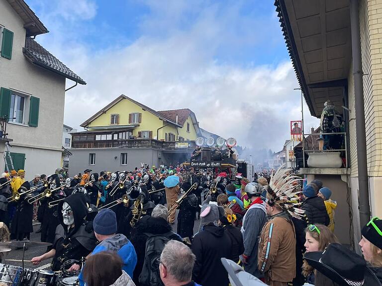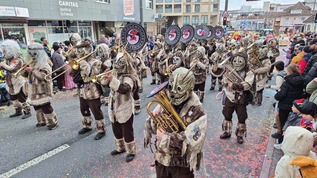 Der Wylägerer Umzug hat begonnen. Die einheimischen Möschtliblöser feiern heuer ihr 60-Jähriges und führen den Umzug an. Bald folgen die traditionellen Badjöggel!