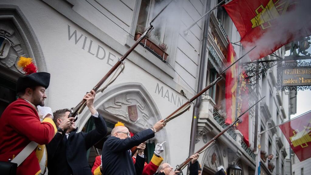 «Ui, ech hoffe nor, de Pfister hebt das Gwehr gnueg i d'Höchi!», sagt eine Zuschauerin am Samstag um kurz nach 16 Uhr vor dem Hotel Wilden Mann in Luzern zu ihrem Nachbar. Hier läuft gerade die traditionelle Abholung des Fritschivaters – heuer ist es Stefan Hug – zum Bärteliessen der Zunft zu Safran im KKL. Ehrengast und Verteidigungsminister Martin Pfister (Mitte) hat sich eben von einem der Zunftgrenadiere das Gewehr erklären lassen und drückt beim Salutschiessen ab. Wumm. Geht doch!
