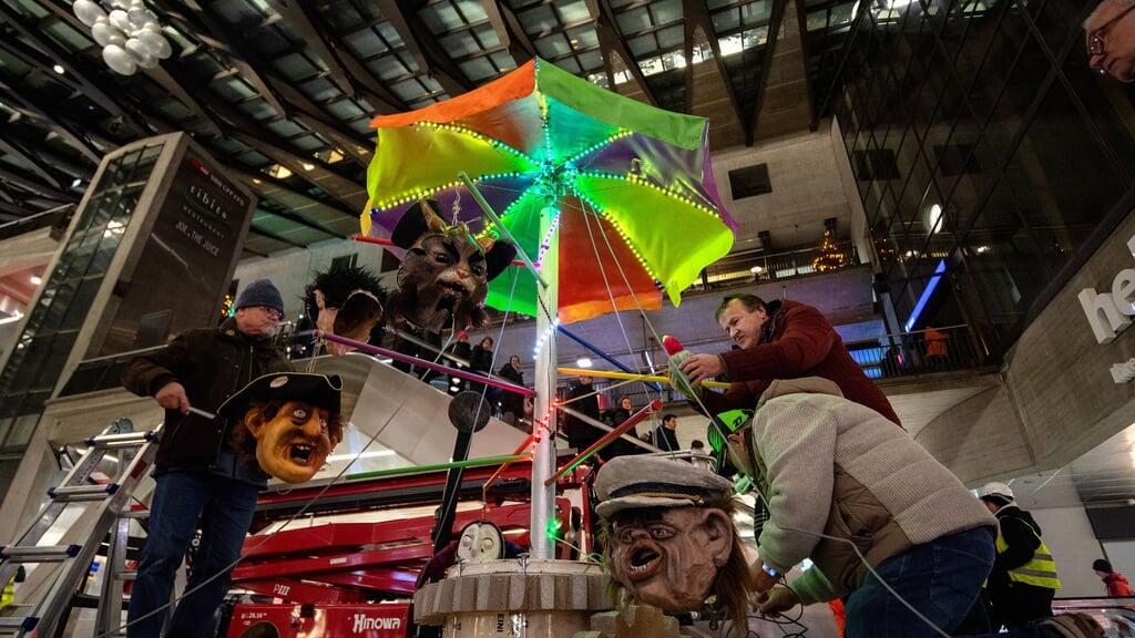 Wenn in der Luzerner Bahnhofshalle rot-weisses Absperrband gezogen wird, wenn sich gelb gewestete und weiss behelmte Frauen und Männer um fasnächtlich geschmückte Sujets scharen, wenn dazu noch ein roter Hebekran bereitsteht, dann kann das nur eines bedeuten: Es ist wieder Zeit für die jährliche Ausstellung zur Bahnhof-Guuggete in luftiger Höhe.
