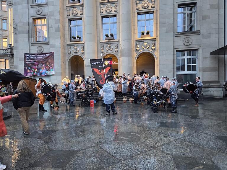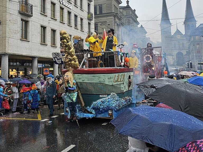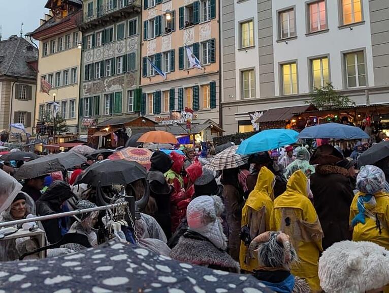 Sie seien trocken geblieben, denn nach dem Restaurant frühmorgens ging es direkt in die Kutsche, zum Orangenwerfen mit Unterstand und jetzt in den «Schweizerhof». «Wir waren positiv überrascht, wie viele Fasnächtler dem Regen trotzten!»