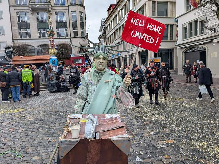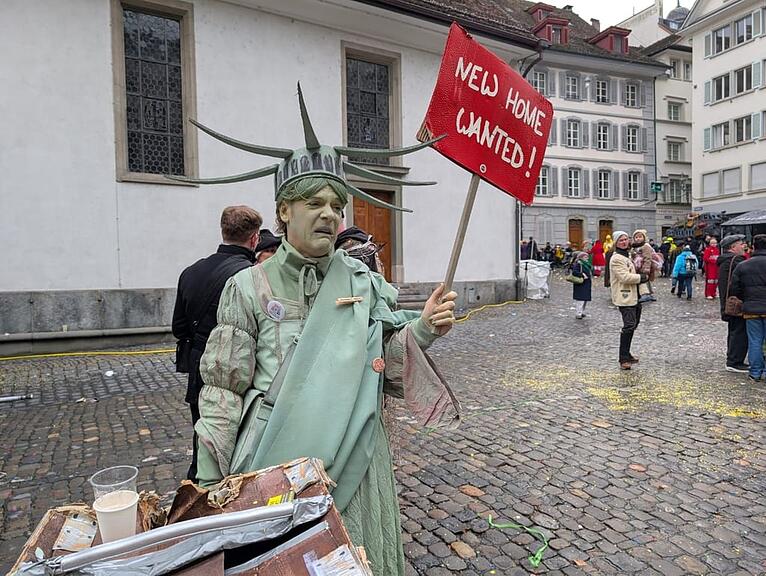 Wen treffen wir denn hier? Eine himmeltraurige Freiheitsstatue hat ihren Weg aus New York an die Lozärner Fasnacht gefunden. Sie ist auf der Suche nach einem neuen Zuhause. Vielleicht liesse sich ja hier in der Leuchtenstadt ein gutes Plätzchen für sie finden, meint sie gegenüber dieser Zeitung. Wer ein gutes Plätzchen kennt, darf sich gerne melden.