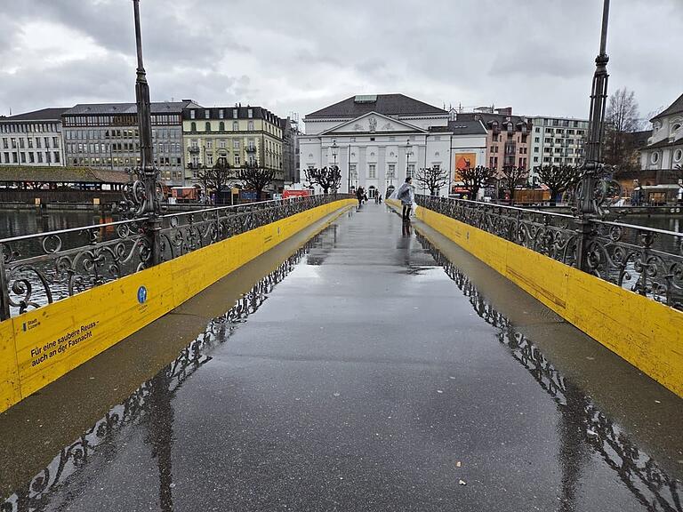 Noch ist der Rathaussteg leer, und das, obwohl derzeit gerade Regenpause ist. Unsere Reporterin bleibt positiv: «Hoffentlich füllt sich das noch heute Abend!»