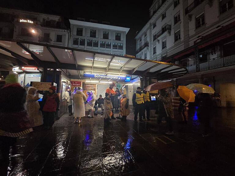 Strategischer Stützpunkt an der Bushaltestelle. Wer dieses Jahr heute um kurz vor 6 verkleidet für die Wey-Zunft erscheint, ist ein echter Fasnächtler. Das Wetter ist es eher nicht.