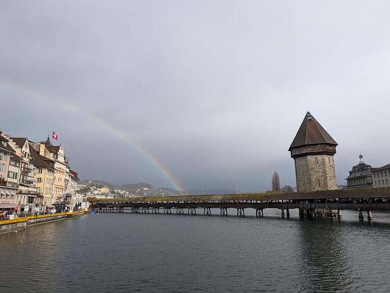 Die Sonne zeigt sich bereits wieder. Schöner Regenbogen über der Kapellbrücke. Vielleicht hat der Wettergott ja doch Erbarmen mit den Lozärner Fasnächtlern.