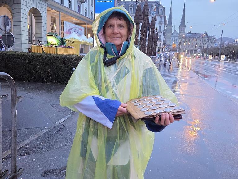 Rita ist definitiv eine Fasnachtsheldin. Trotz des Regens und der frühen Morgenstunde hat sie heute schon 80 Plaquetten verkauft. Bei schönem Wetter wärens aber sicher noch mehr, meint sie.