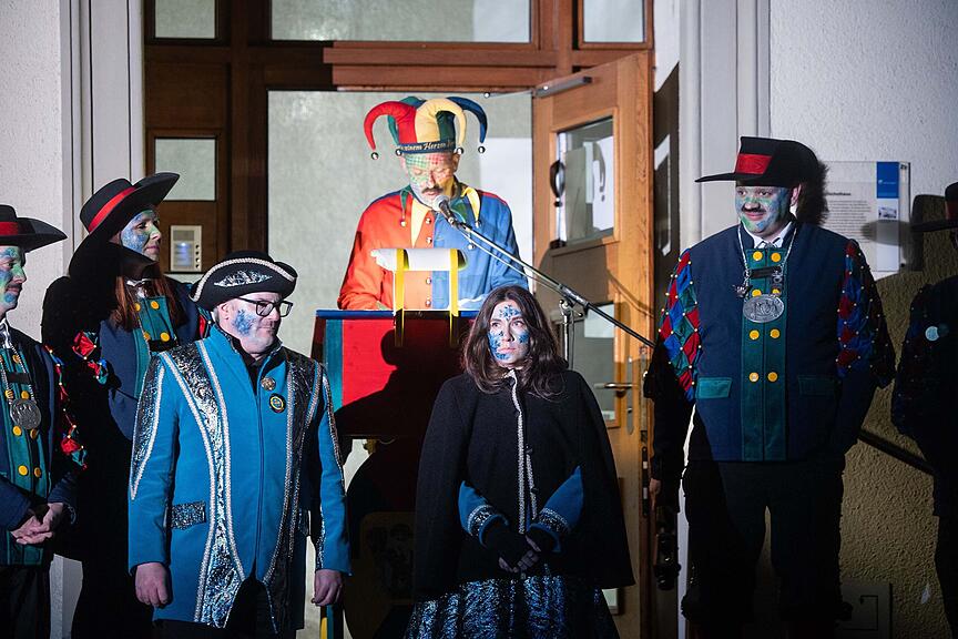 Nach der Vorstellung des Ehrenpaars wird dem Narrenvater Dominik Iten I. das Zepter der Macht vom Gemeindepräsidenten Fridolin Bossard zeremoniell übergeben, womit er bis am Aschermittwoch als oberster Wylägerer amten wird.