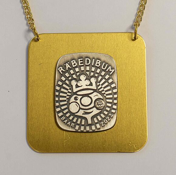 «Der Räbechüng ist bereit für die Fasnacht»: So beschreibt der Baarer Grafiker Qsi Gisler die von ihm gestaltete Plakette für die Baarer Räbefasnacht 2023. Die Plakette ist ab sofort in drei Versionen erhältlich: in Silber (15 Franken), in Gold (30 Franken) sowie als Gönnerplakette (100 Franken). Der Erlös aus dem Plakettenverkauf kommt vollumfänglich der Räbefasnacht Baar zugute, wie die Fasnachtsgesellschaft Baar mitteilt.
