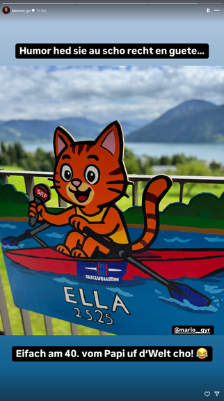 Auf Instagram geteilt haben die frischgebackenen Eltern auch die Geburtstafel ihrer Tochter, die das Kind als Katze mit einem SRF-Mikrofon auf einem Ruderboot des Seeclubs Luzern zeigt.