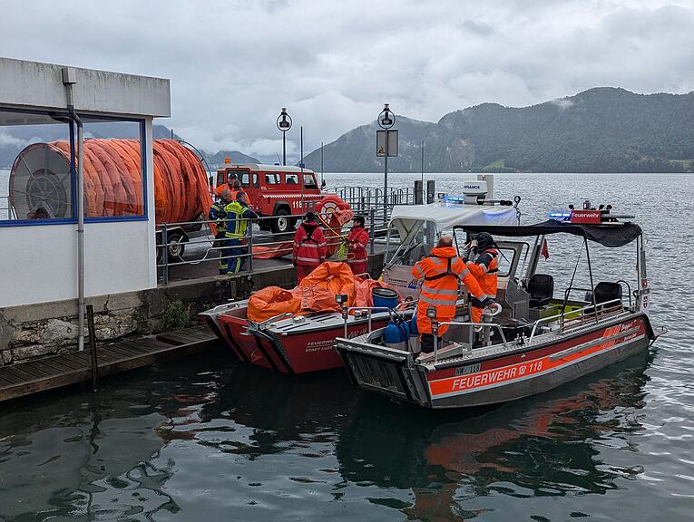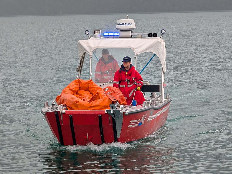 Die Feuerwehr bringt Material auf den See.