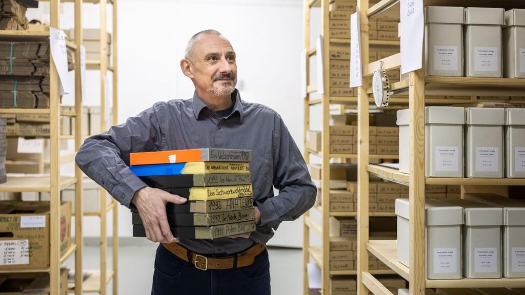 Der langjährige Fotodok-Geschäftsführer Simon Meyer mit Archivmaterial. Er leitet seit Anfang Jahr die neue kantonale Fachstelle, die Luzerns fotografisches Erbe bewahrt.
