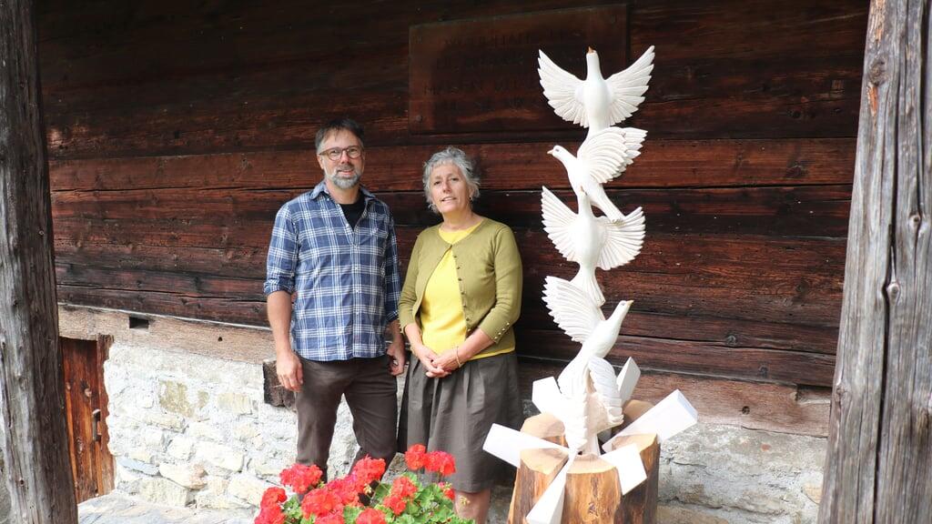 Bildhauer Reto Odermatt und Doris Hellmüller, Geschäftsführerin des Fördervereins Niklaus von Flüe und Dorothee Wyss, mit der Skulptur «Zentrum des Friedens».