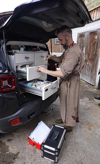 Das Telefon läuft heiss an diesem Montagmorgen. «Man weiss nie, was der Tag mit sich bringt», sagt Marc Butty (40), der erfahrene Grosstierarzt. Das Labor, die umfangreiche Apotheke und die beiden Operationsräume stehen ihm zur Verfügung. Das Veterinärauto mit der mobilen Ausrüstung und über 60 Medikamenten steht startklar vor der Garage. Schneeketten sind prophylaktisch an Bord.