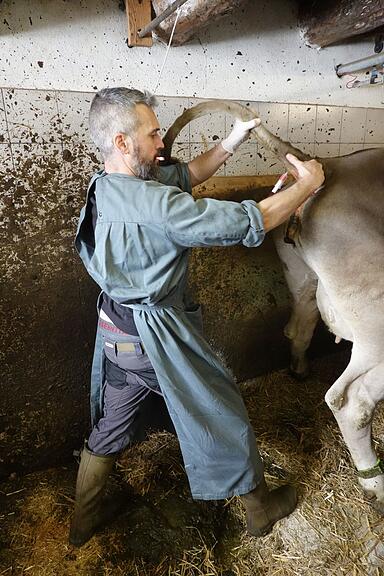 Die Enthornung eines Kalbs, das später auswärts in einem Laufstall gehalten wird, steht noch auf dem Programm. Das fünfwöchige Jungtier lässt die Prozedur dank der Betäubung und dem injizierten Schmerzmittel schnell geschehen. Die Verödung der Hornanlagen geschieht mit einem gasbetriebenen Enthornungsgerät. Ein besonderes Augenmerk gilt beim Entfernen auch dem umliegenden Gewebe. Noch die Einträge ins Behandlungsjournal, ein kräftiger Händedruck und Dank zum Abschied und schon geht’s weiter Richtung Spiringen.