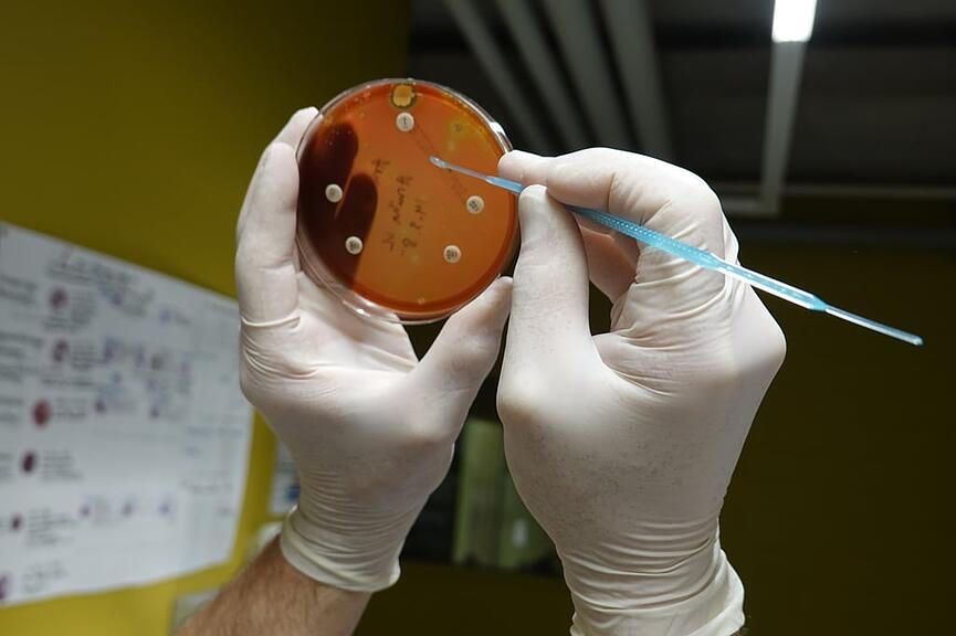 Inzwischen hat sich die Agenda an diesem Morgen gefüllt. Zuerst noch ein Blick am Labortisch in den Inkubator mit verschiedenen Milchkulturen. «Die Untersuchung von Milchproben auf den Erreger «Staphylococcus aureus» ist entscheidend für die Bekämpfung von Euterentzündungen», hält Butty fest. Der Nachweis des Mastitis-Erregers ist klar ersichtlich. In einer Petrischale sind die Bakterien zu einem Plättchen neben dem Penicillintropfen angewachsen. Es gilt daher, ein anderes Antibiotikum beim erkrankten Tier anzuwenden. Die Übertragung der Erreger erfolgt bei Kühen über den Melkakt.
