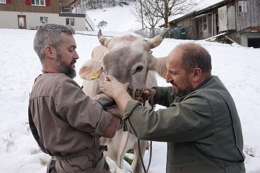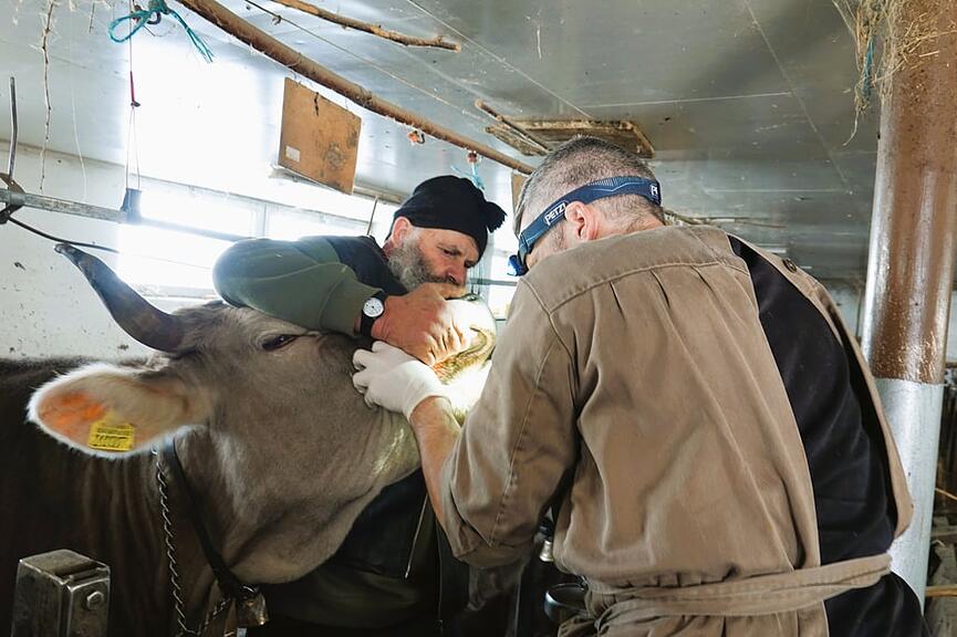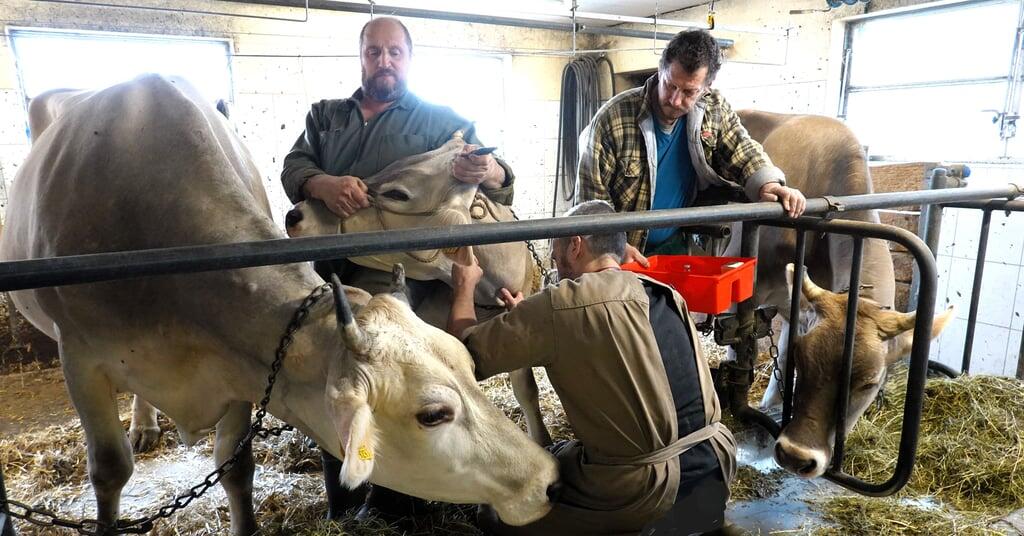 Geduldig lässt Kuh Halma die intravenöse Verabreichung von Antibiotika und einem Schmerzmittel über sich ergehen. Mit den Hinterbeinen höherstehend gelingt es auf der nahen Weide, den Magneten zielbestimmt in den Schlund des Tieres einzuführen. Bauer Peter Riedi ist froh. Das Tierwohl liegt ihm sehr am Herzen. Der Bluterguss bei der Kuh Orewa erweist sich zum Glück als harmlos.