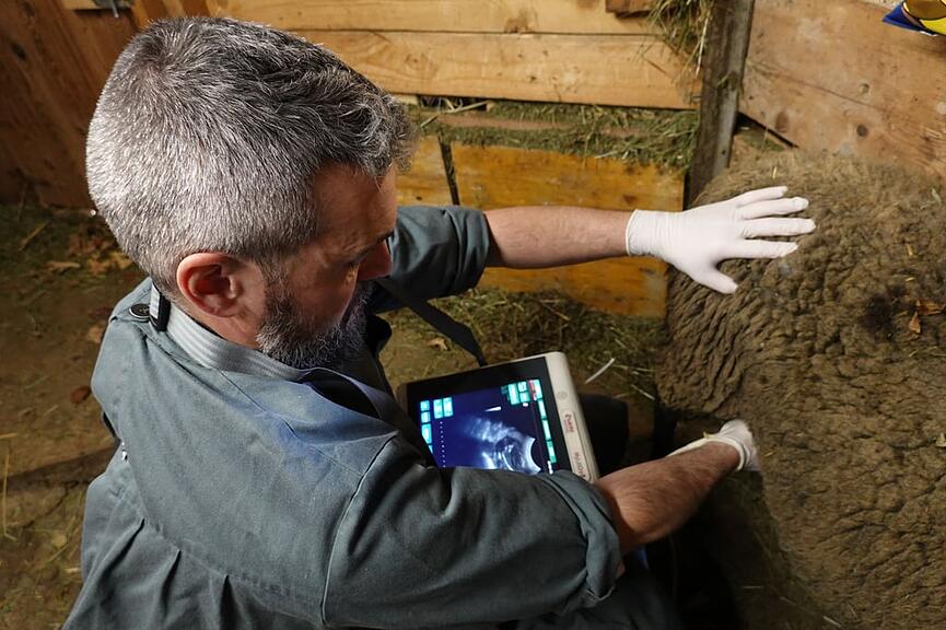 Nach einem kurzen Schwatz geht es weiter zu einem Schafbauern. Die Moderhinke belastet seine Tiere seit längerer Zeit. Die schmerzhafte Klauenkrankheit lässt sich hier nur mit einer Sanierung des Betriebes ausmerzen. Nun scheint es so weit zu sein. Doch nicht alle Bedenken sind aus dem Weg geräumt. Weitere viertelstündige desinfizierende Klauenbäder sind nötig. Dafür ist die Ultraschalluntersuchung der Auen erfreulich. An Nachwuchs wird es nicht fehlen.