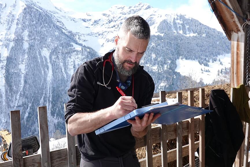 An Erlebnissen fehlt es Marc Butty nicht. Sei es mit Helikopter, Snowboard oder zu Fuss im knietiefen Schnee abgelegene Höfe zu erreichen oder schwierigen Geburten mit allen Kräften beizustehen. «Das Schönste für mich ist eine erfolgreiche Geburt», sagt er mit einem Strahlen. Gelegentlich muss der ehemalige Kompaniekommandant aber auch hart im Nehmen sein. Letztes Jahr traf ihn ein Kuhhorn am Hals. Es blutete stark und Nähen war später im Tal angesagt. «Desinfektionsmittel und Verbandstoffe habe ich immer griffbereit», sagt er nachdenklich und zeigt am linken Bein einen kürzlichen Bluterguss von einem Kuhtritt.
