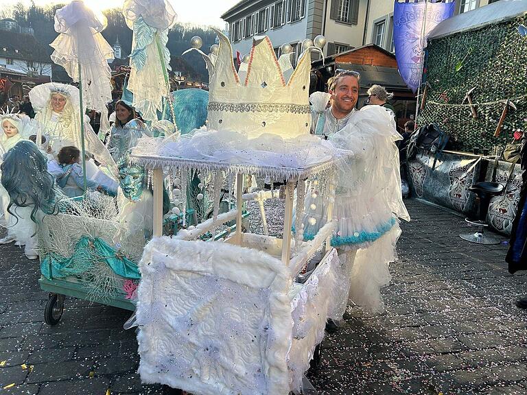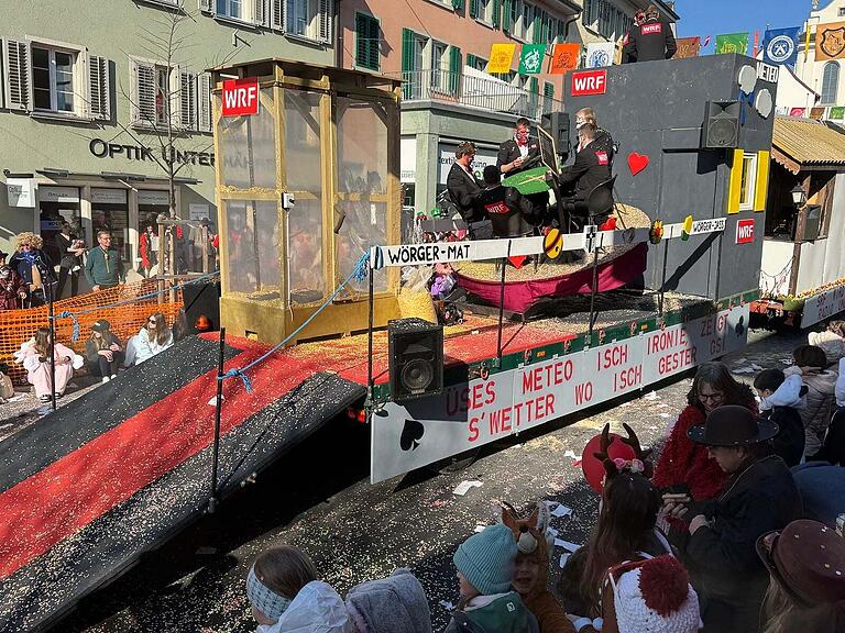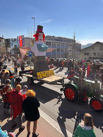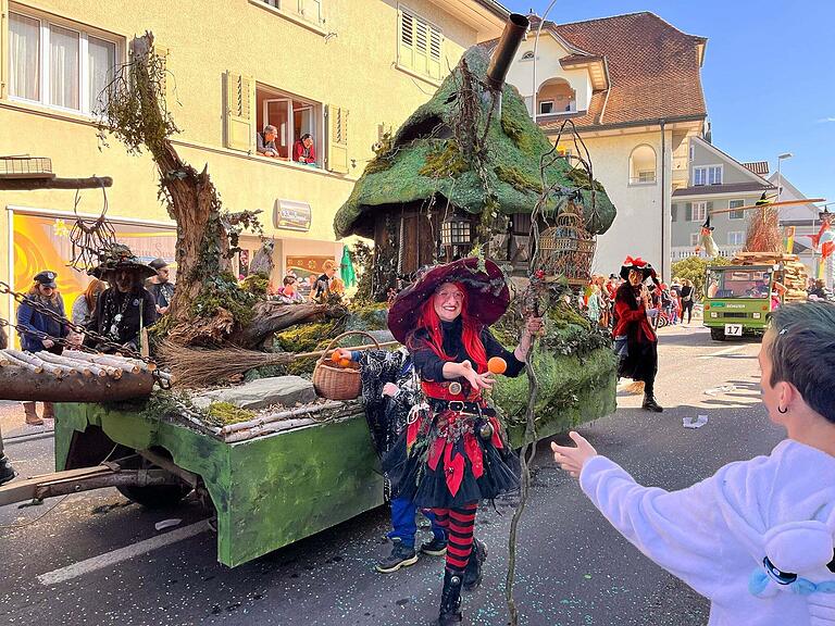 Der Umzug in Triengen läuft bei Traumwetter auf Hochtouren. Hier kommt der Wagen mit Zunftmeisterin Colline. Das Beste kommt ja bekanntlich zum Schluss...