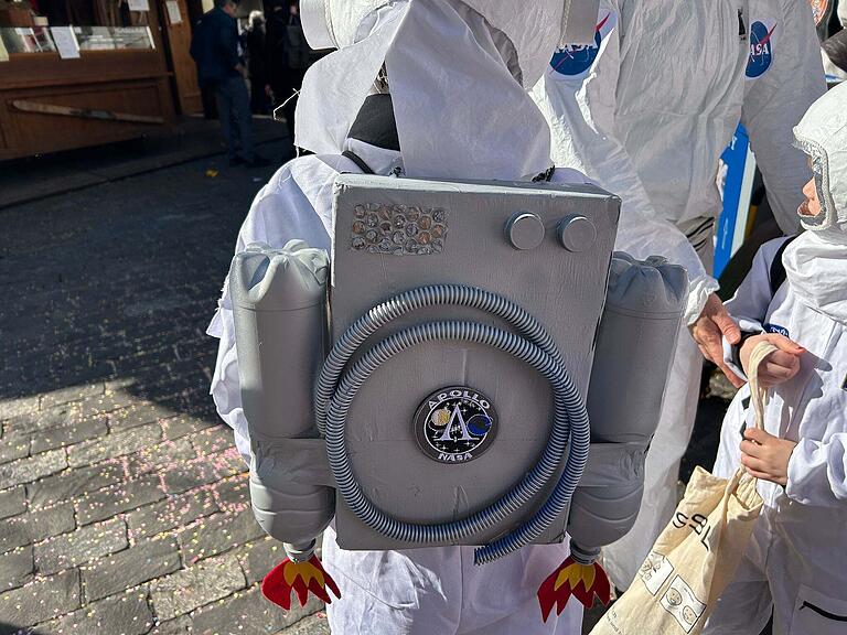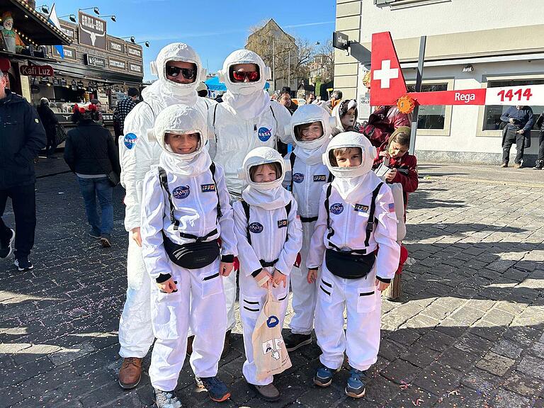 Für das entgegengesetzte Motto hat sich diese Familien entschieden. Die Nachfolger vom Schweizer Astronauten Marco Sieber sind in der Luzerner Innenstadt unterwegs. Mit selber gebasteltem Grend und Packjet heben sie nach dem Güdisdienstag wieder ab und Reisen mit ihrer Apollo 27 auf zum Mond.